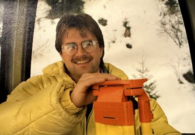 Mitten im Zillertal, umgeben von Schnee, führt unser Michl eine Baukontrolle an der Bergstation eines Schilifts durch. Schon damals gehörte die Vermessung im alpinen Gelände zu den besonderen Stärken von Trigonos.