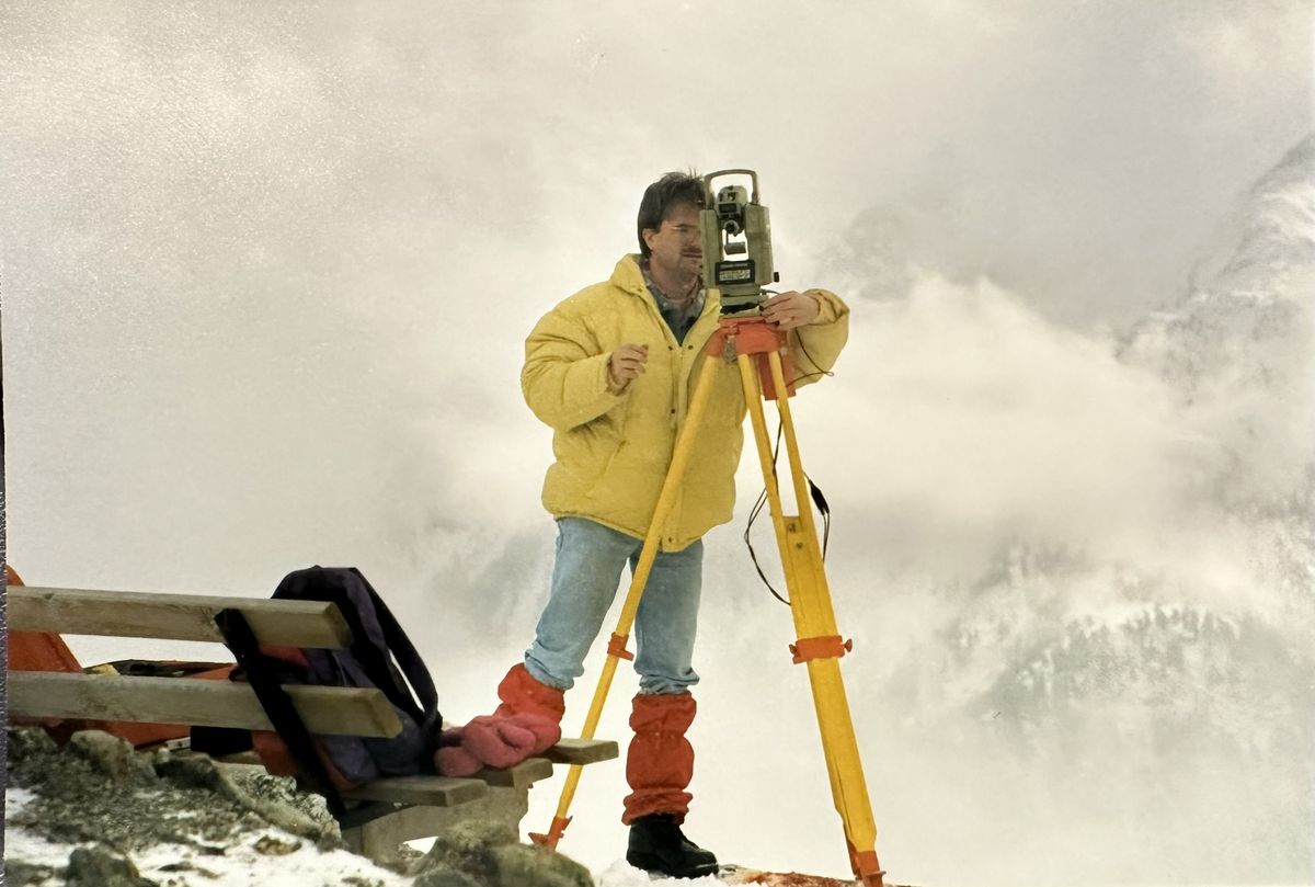 Mitten im Zillertal, umgeben von Schnee, führt unser Michl eine Baukontrolle an der Bergstation eines Schilifts durch. Schon damals gehörte die Vermessung im alpinen Gelände zu den besonderen Stärken von Trigonos.