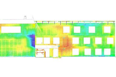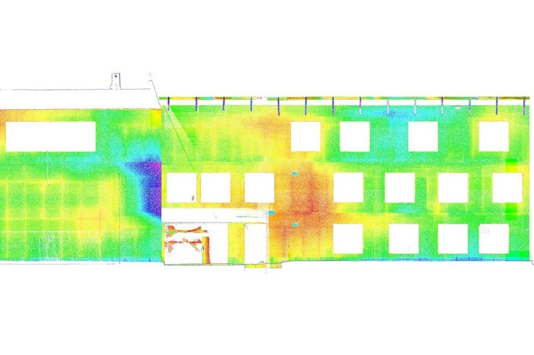 Mittels hochpräziser 3D-Laserscanaufnahme erfassten wir die gesamte Fassadenfläche und generierten daraus eine vollständige Punktwolke. Diese diente als Basis für eine detaillierte Ebenheitsanalyse. So ließen sich mögliche Abweichungen frühzeitig erkennen und gezielt in die Planung integrieren. Zusätzlich leiteten wir aus den Scandaten digitale Grundrisse und Fassadenansichten ab.